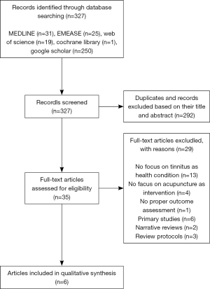 - Google Scholar (limited to the first 250 items): "acupuncture" AND "tinnitus" AND "systematic review".